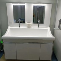 高分子洗手池材质特点:采用高分子材料一次吸塑成型,出水方式有:感应式、膝控式、脚踏式和手动开关,一台洗手池可客户要求选择单一出水方式或多种出水方式。洗手池分高背和低背,高背总高度1800mm,配有美容镜,照明灯,皂液器,可按客户要求配置烘手器和热水器。低背板无配置。