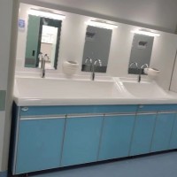 高分子洗手池材质特点:采用高分子材料一次吸塑成型,出水方式有:感应式、膝控式、脚踏式和手动开关,一台洗手池可客户要求选择单一出水方式或多种出水方式。洗手池分高背和低背,高背总高度1800mm,配有美容镜,照明灯,皂液器,可按客户要求配置烘手器和热水器。低背板无配置。