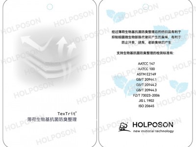 薄荷抗菌防臭整理剂TexTrit®A-X是一种由薄荷中提取的薄荷醇复合有机高分子抗菌整理剂,能有效抑制金黄色葡萄球菌、大肠杆菌、白色念珠菌等革兰氏阳性和革兰氏阴性细菌的生长。薄荷安全清新能有效中和异味分子,让纺织品具有清新感,减少因异味带来的不舒适感。适用于如棉、黏胶、涤纶、尼龙等混纺织物。主要应用在服装、家纺、医用防护无纺布等纺织品.